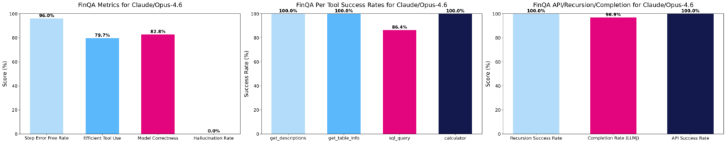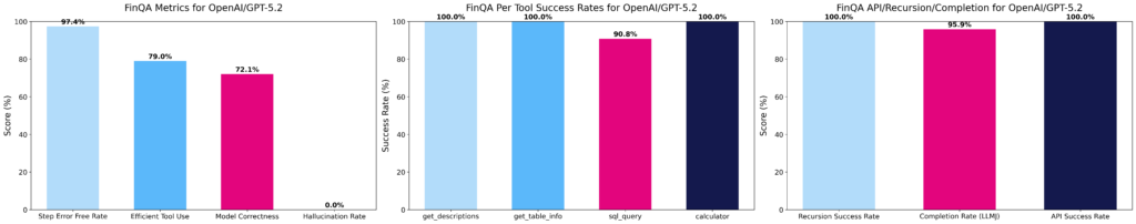 Per-tool success rates isolate which tools the model struggles with. For example, in FinQA, sql_query can lag behind get_descriptions and get_table_info, which suggests models can discover schemas but struggle to write correct queries. This pinpoints where reward shaping or targeted data would help most.