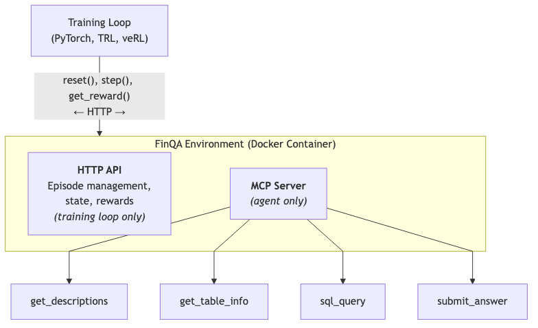 OpenEnv, the open standard for agentic execution environments from the Meta PyTorch and Hugging Face teams, provides a structure that makes it a natural fit for FinQA. Here are a few key design choices that make OpenEnv a great framework for RL environments.